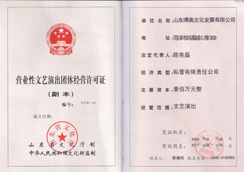經(jīng)菏澤市文化局批準(zhǔn),我公司取得編號為菏文演-056號《營業(yè)性文藝演出團(tuán)體經(jīng)營許可證》。