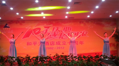 慶典活動最后,在場來賓欣賞了手語操《感恩的心》、拉丁舞、民族舞蹈、歌曲《和諧大家園》、《為了誰》等精彩文藝節(jié)目,表達了和平大酒店對所有來賓十年來的關(guān)注與支持的感恩之情。一曲《越來越好》終了,和平大酒店開業(yè)十周年慶典儀式圓滿結(jié)束。 | |