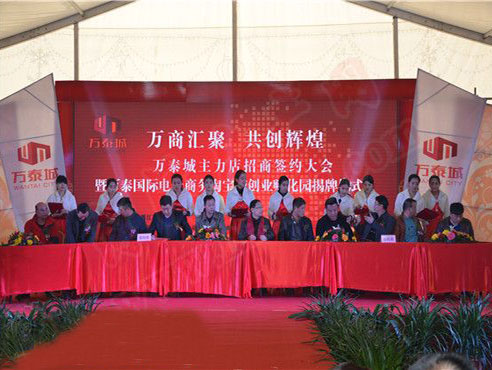 下午3點,在絢麗壯觀的開場舞《龍騰虎躍》后,由央視著名主持人石軍、菏澤電視臺主持人丁可主持的簽約大會拉開了帷幕。以萬泰城發(fā)展為主題的沙畫表演刻畫下萬泰城美好藍圖,美輪美奐的模特走秀節(jié)目向現(xiàn)場嘉賓展示了此次簽約的十大品牌商家。萬泰置業(yè)總經理樓偉平先生與各主力品牌廠商代表集體上臺現(xiàn)場簽約并握手合影留念,達成此次戰(zhàn)略合作。瞬間,高亢的音樂與動感的燈光交錯融合,配合LED背景屏顯現(xiàn)出各個品牌廠商的Logo旋轉飛舞,最終匯聚在“萬商匯聚、共創(chuàng)輝煌”背景上,全場掌聲雷動。隨后,菏澤市商務局領導與共青團市委書記與定陶縣宣傳部長共同為萬泰城電子商務孵化基地揭牌。