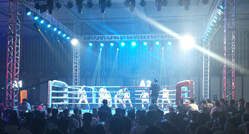 我公司承接了本次活動(dòng),在活動(dòng)現(xiàn)場布置了高清高亮LED大屏,D10線陣音響,結(jié)合我們最新的燈光設(shè)備轟天炮,巨無霸以及明道440,為搏擊賽場打造了一場完美視覺盛宴! | |