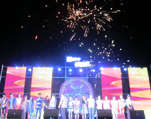 本場(chǎng)比賽由市電視臺(tái)節(jié)目主持人志強(qiáng)、丁珂以及兩名醫(yī)專學(xué)生共同主持,醫(yī)專師生五千余人歡聚一堂,共同渡過(guò)了一個(gè)美好的夜晚。經(jīng)過(guò)預(yù)賽、復(fù)賽,層層選拔出的20名選手,在奢華的舞臺(tái)上最終角逐,16號(hào)選手夏勝楠?jiǎng)俪觯@得了本次比賽的冠軍。觀眾們激情高昂,手中的熒光棒與多變的燈光、LED大屏幕相輝映,比賽現(xiàn)場(chǎng)始終洋溢著和諧與歡樂(lè)的氣氛。
