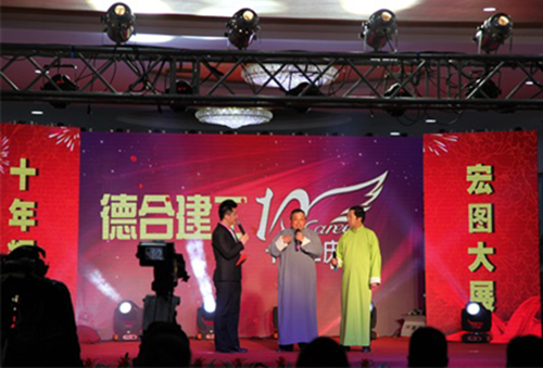 3月10上午,十年風(fēng)雨,十年征程,德合建工集團(tuán)十周年慶典在公司展廳內(nèi)舉行。合作單位及數(shù)百名德合員工歡聚一堂,共慶十周年華誕。舞蹈、相聲、歌曲、卓別林魔術(shù)等精彩的節(jié)目展示了德合建工的無(wú)限活力與創(chuàng)意,贏得了現(xiàn)場(chǎng)陣陣掌聲,帶給大家無(wú)限的歡樂,讓人回味無(wú)窮!